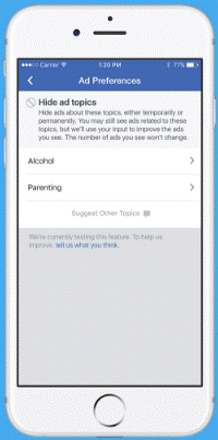 „Dies ist ein früher Test, der es den Leuten ermöglicht, Anzeigenthemen zu verbergen, die sie lieber nicht sehen möchten“, sagte ein Facebook-Sprecher gegenüber Business Insider. „Wir beginnen mit Alkohol und Elternschaft , da dies die beiden häufigsten Themen waren, die in unserer Forschung auftauchten.“